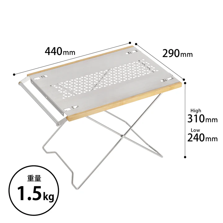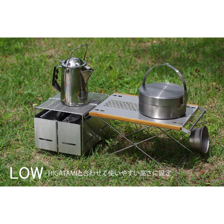 เป็นโต๊ะข้างกองไฟพร้อมปรับความสูงได้สองระดับ เนื่องจากแผ่นปิดด้านบนสแตนเลสจึงสามารถใช้งานได้แม้ว่าคุณจะใส่ของร้อนหรือหัวเตาก็ตาม