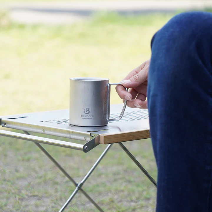 แก้วไทเทเนียมน้ำหนักเบาพร้อมที่จับพับได้ ซึ่งสะดวกในการวางซ้อน นอกจากนี้ยังสามารถพกพาขนาดต่างๆ ซ้อนกันได้อีกด้วย ทําจากไทเทเนียมที่มีการนําความร้อนต่ำ มีโครงสร้างกลวงที่ป้องกันไม่ให้เครื่องดื่มเย็นลง